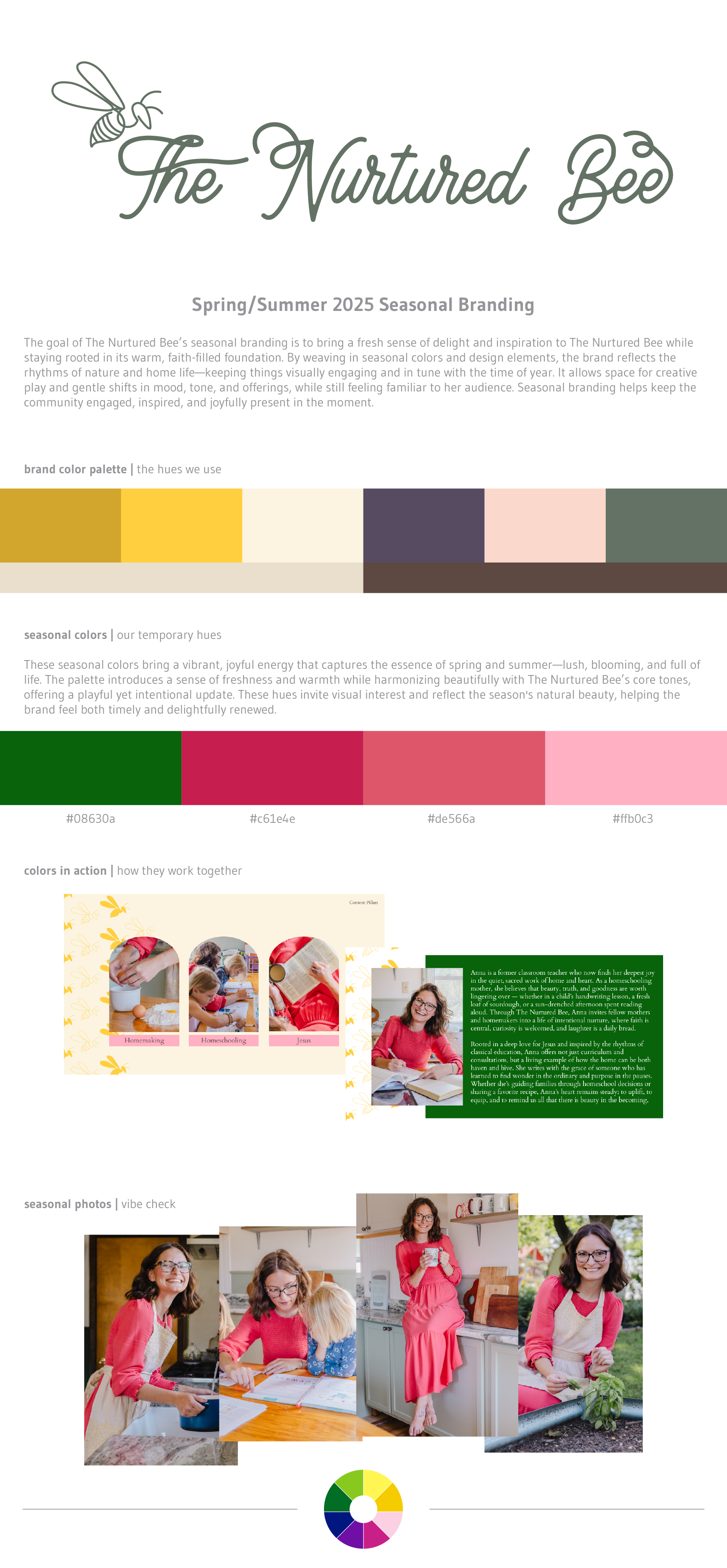 For The Nurtured Bee’s Spring/Summer 2025 seasonal look, we pulled inspiration directly from Anna’s seasonal brand photo shoot. The coral dress she wore stood out as the perfect starting point. From there, I used a color palette tool to build complementary seasonal colors that would: